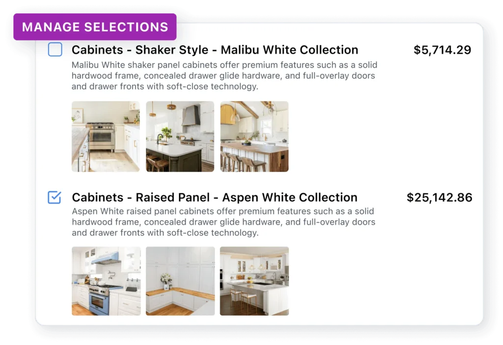 Managing choices for your project has never been easier. From materials and finishes to fixtures and colors, view all of your selections in one place, keeping everything organized and clear.